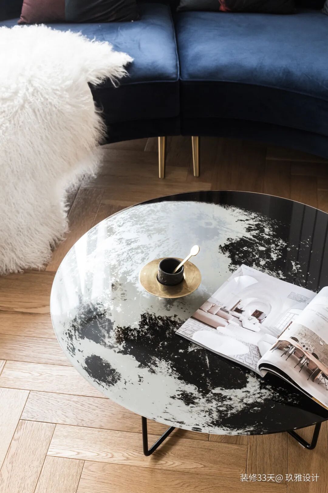 ▲ 丝绒面料的沙发,原木色地板铺一张温暖的短毛地毯,还有冰冷的大理石面茶几,各种材质相互碰撞交融