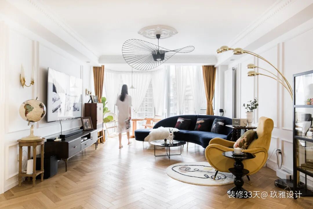 ▲ 人字铺木地板从餐厅延伸至客厅,顶面以石膏灯盘搭配草帽灯突出造型,姜黄色和白色打底,中间放置一款丝绒的深蓝色弧形沙发,复古色系的特点就是饱和度低、色泽浓郁