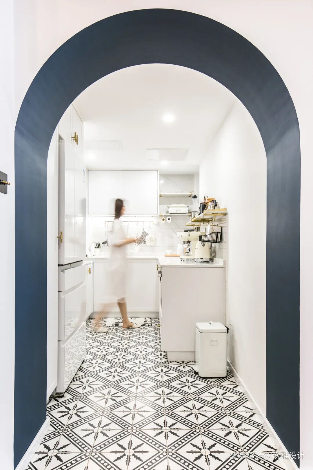 ▲ 厨房入口的拱形门洞,400mm的门洞会显示有点厚重,设计师逆向思维,把这个门洞刷成夜幕蓝搭配纯白色的厨房,给人一种满满的仪式感