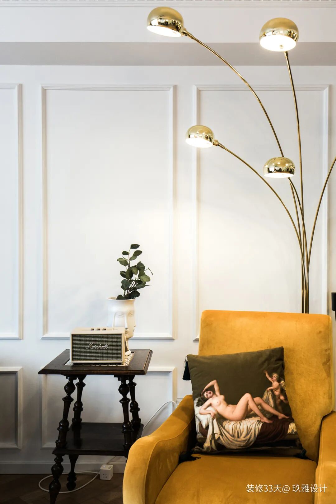 ▲ 简单的石膏线勾勒大气背景,高饱和的绒面单椅搭配复古边几,点缀中古风软装饰,某宝淘到小众落地灯成为角落高光