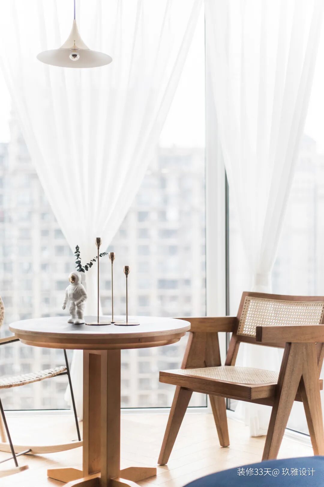 ▲ 将不规则的阳台打造成采光与视野无死角的休闲区,木作与白纱相互映衬轻盈与自然