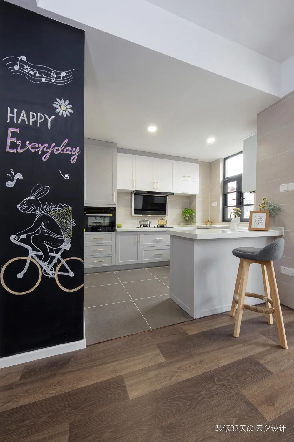 ▲ 打开餐边的厨房,开放式设计让餐厨连接更加紧密,同时通风和采光更好,左侧L型墙面做成磁性黑板墙,右侧为简餐吧台