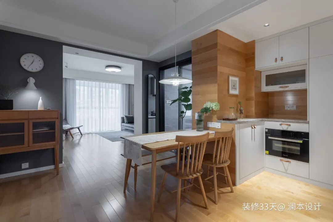 ▲ 将厨房门向内推进45公分,烟道立面和收纳柜立面形成约90公分宽的墙体,餐桌完美依傍,背景采用传统品牌的特价小规格实木地板