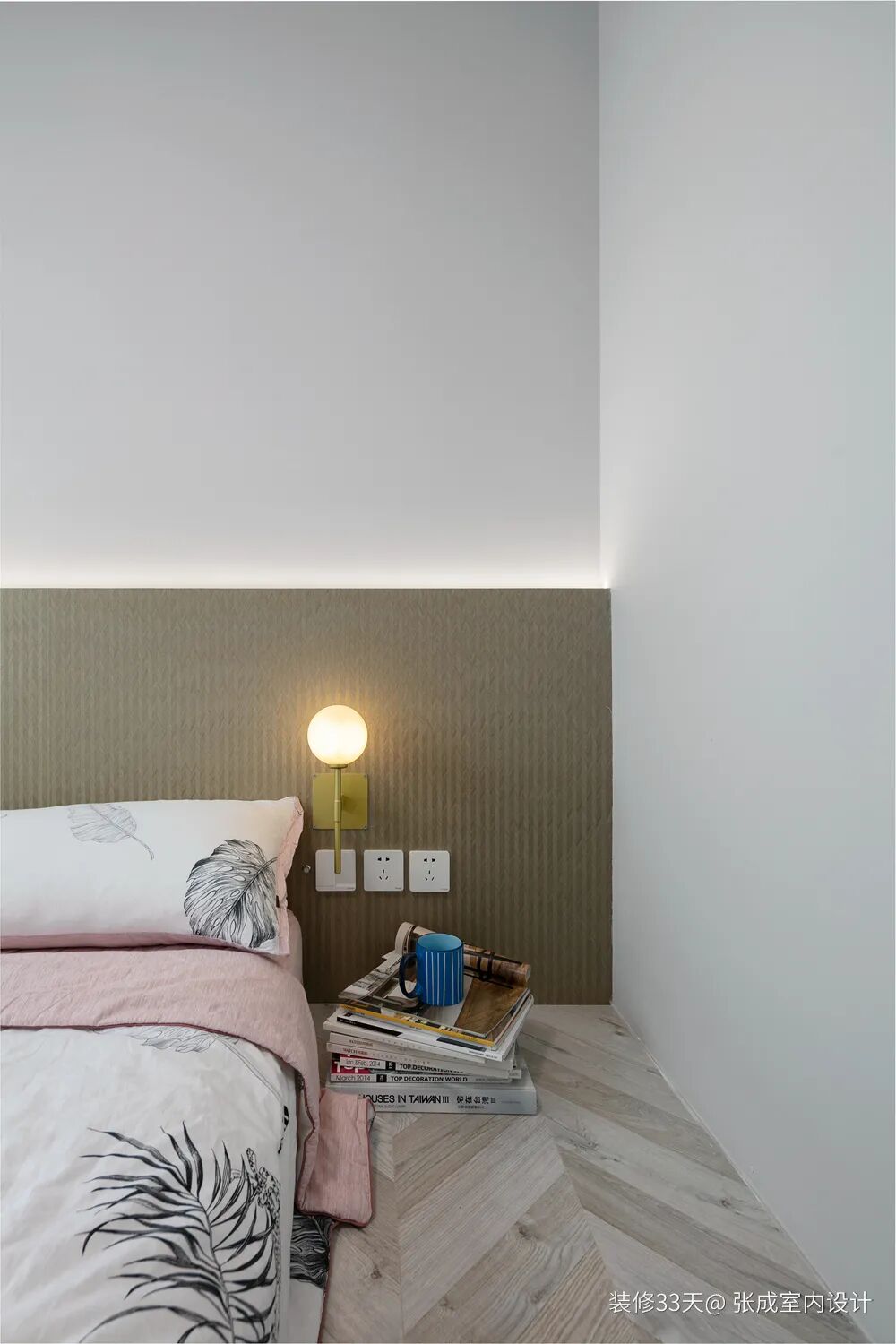 ▲ 用科定板做了半高床头靠背,上面做了嵌入式灯带,结合壁灯满足不同层次的灯光需求