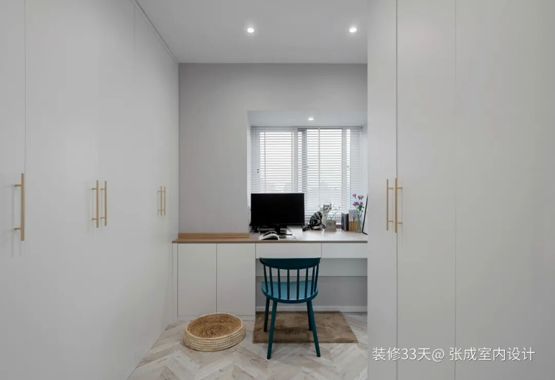 ▲ 原主卧改造成衣帽间兼书房,大面积白色置顶衣柜带来强大的收纳功能,利用原飘窗位置定制书桌