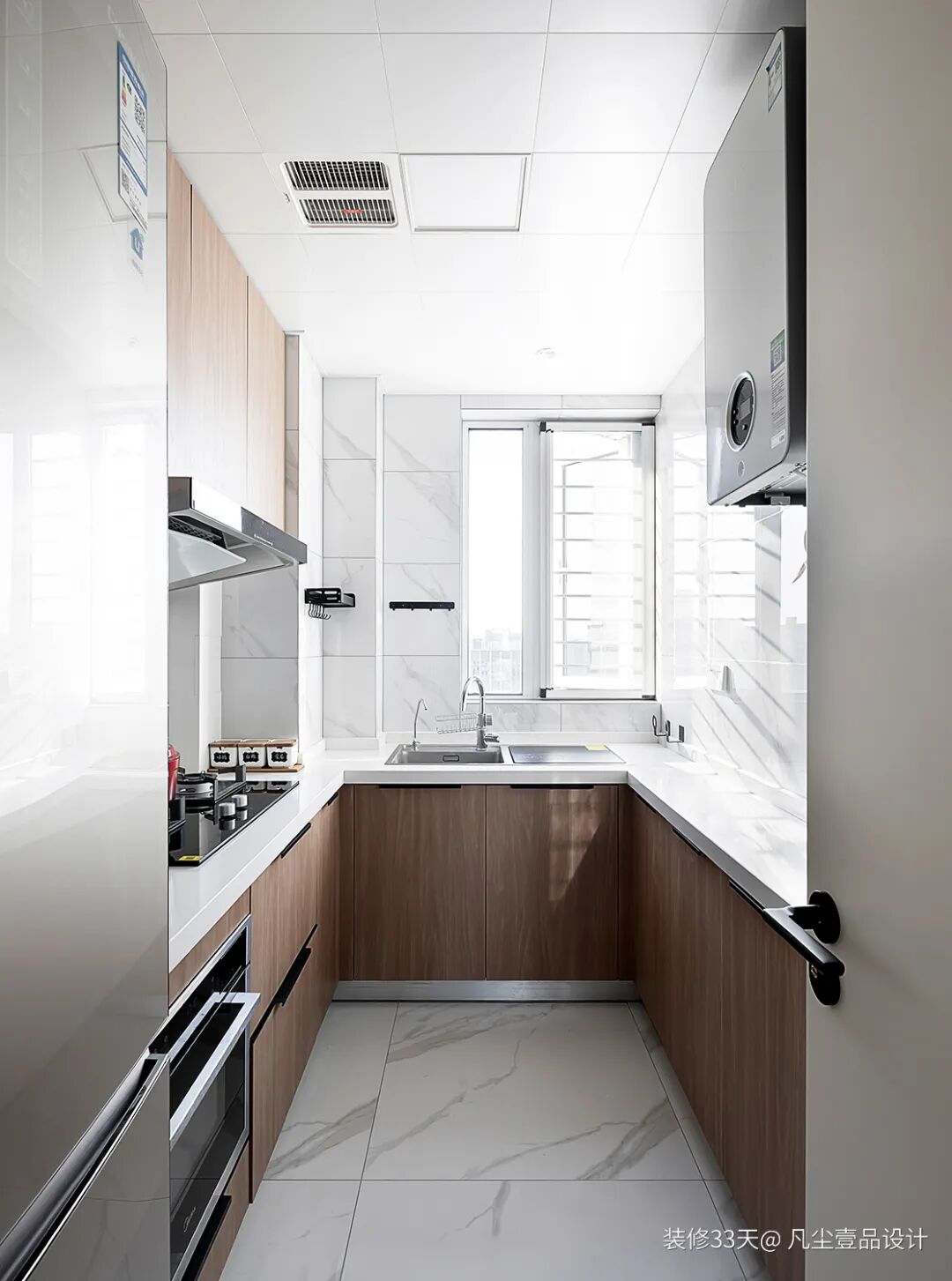 ▲ 厨房,U型布局提高空间利用率,墙地统一铺贴白色灰纹瓷砖,搭配木色橱柜门,简洁经典
