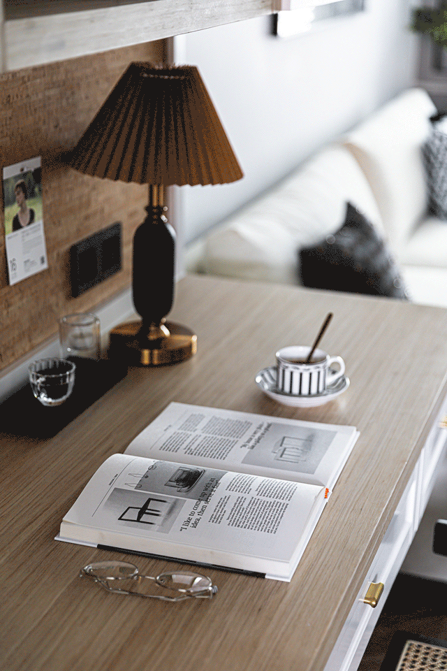 ▲ 划分客餐厅空间的开放式办公桌,可以与家人共同享受安静的学习时光