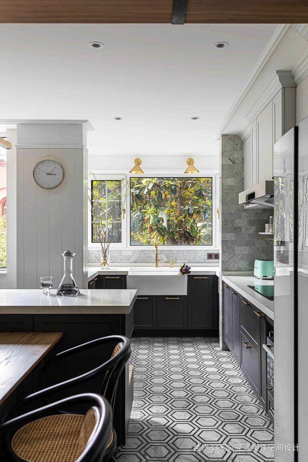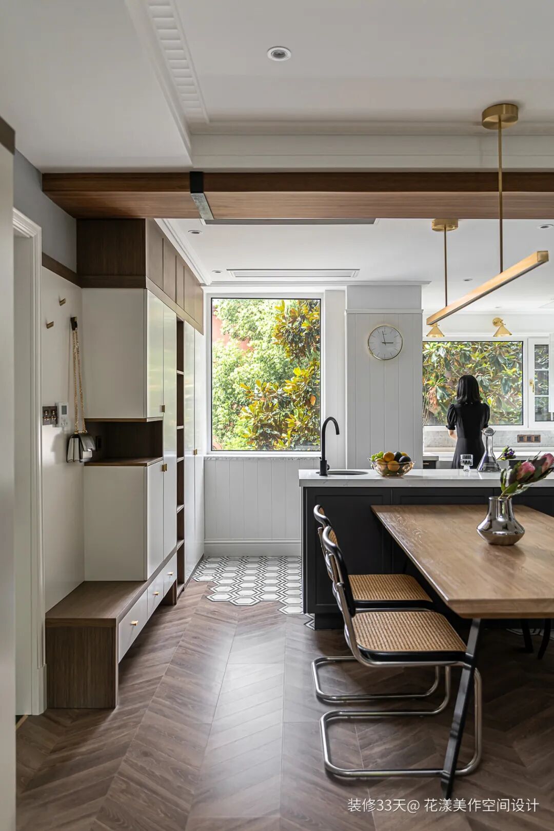 ▲ 地面采取六角砖与地板拼接的形式,利于厨房操作空间地面的打理,餐厅区域的岛台与餐桌呈T字型摆放
