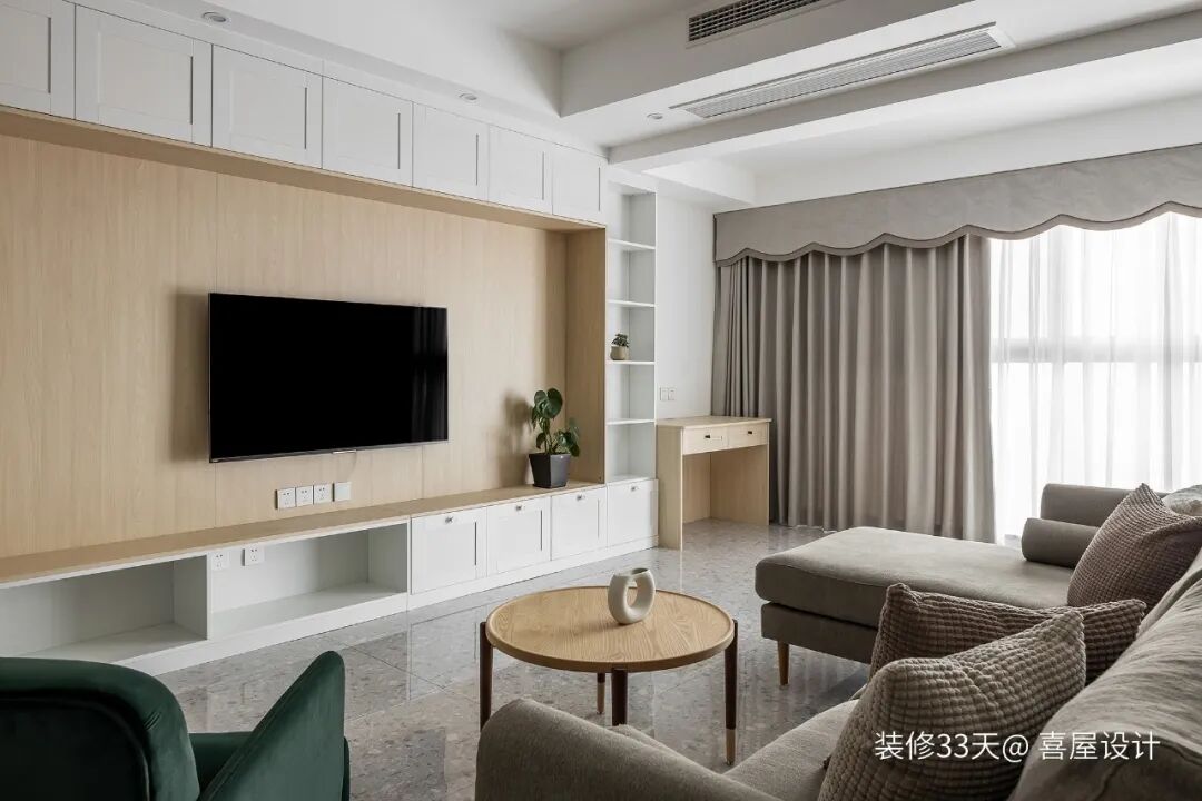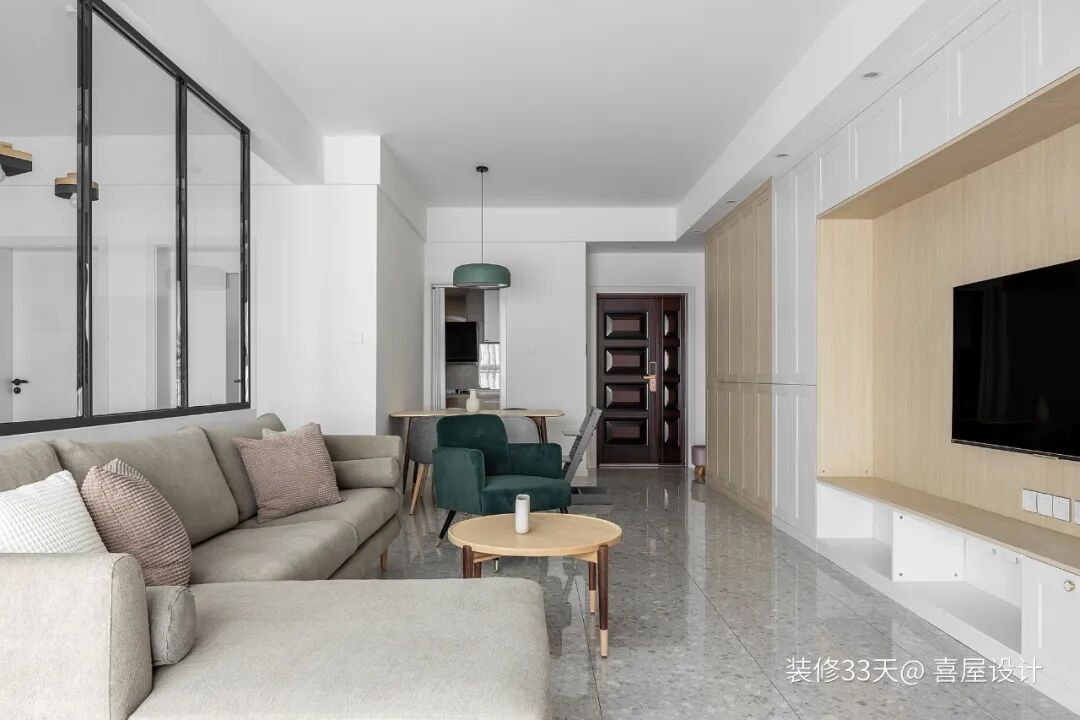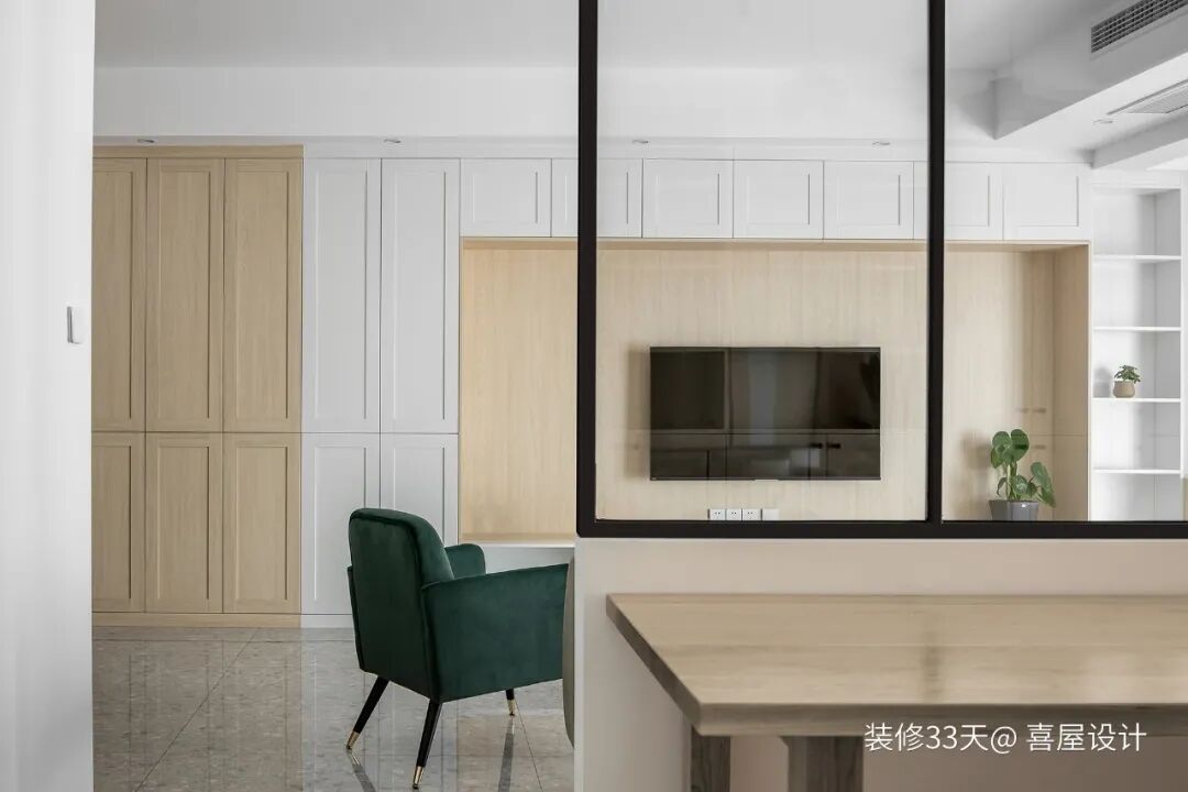 ▲ 电视墙以原木色和白色相结合,配以精心挑选的墨绿色丝绒单人椅点缀空间
