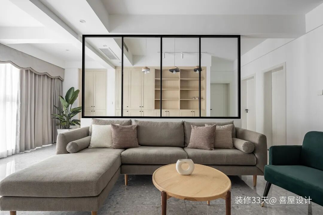 ▲ 客厅通铺灰色地砖,点光源取代主灯,让整个空间更加敞亮开阔,作为休闲、会客、玩耍、工作等多重属性,是不同功能需求的满足,更是生活里的点滴幸福