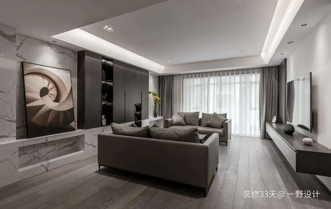 ▲ 无主灯顶面嵌入灯带制造悬浮感,背景用黑白纹路的大理石搭配深色木作,既有层次又彰显档次