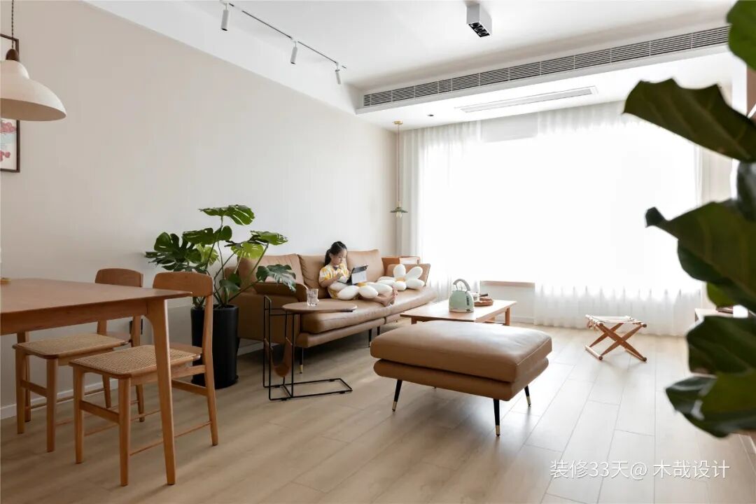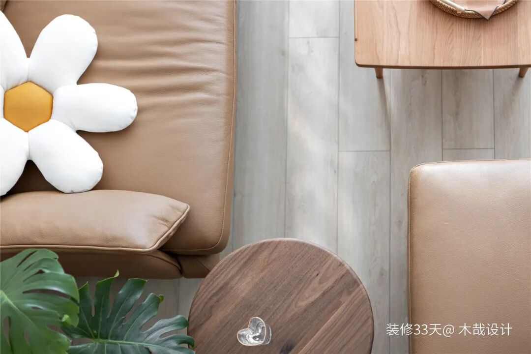 ▲ 全屋活动家具以温暖的樱桃木为主,日式主调搭配简约感的皮质沙发,呈现出非常和谐的视觉效果