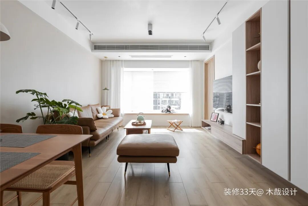 ▲ 白色与橡木色组合的悬空电视柜,增加公领域的储物容量,同时柜体也显得轻盈,更增添全屋的日式气息