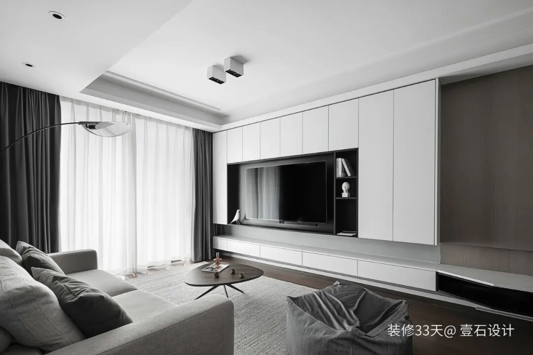 ▲ 定制柜体式电视背景,平整的白色柜门中间留空黑色背景安装电视机,下方分离式设计抽屉柜,收纳客厅的日常小件