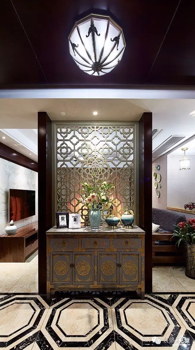 ▲ 中式花纹隔断,搭配中式的玄关柜和中国色的墙面,风格明显