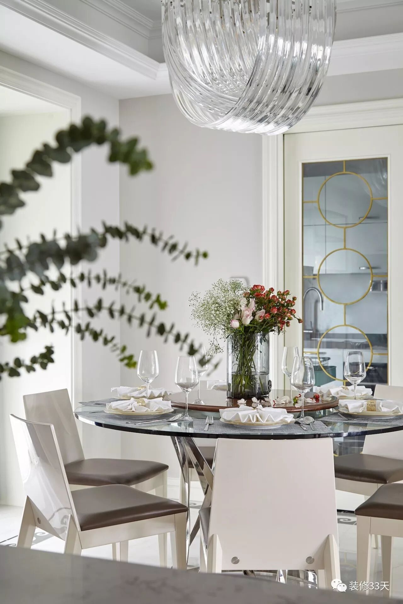▲ 餐厅玻璃大圆桌,搭配剔透水晶灯,精致餐具与鲜切花,营造唯美就餐环境