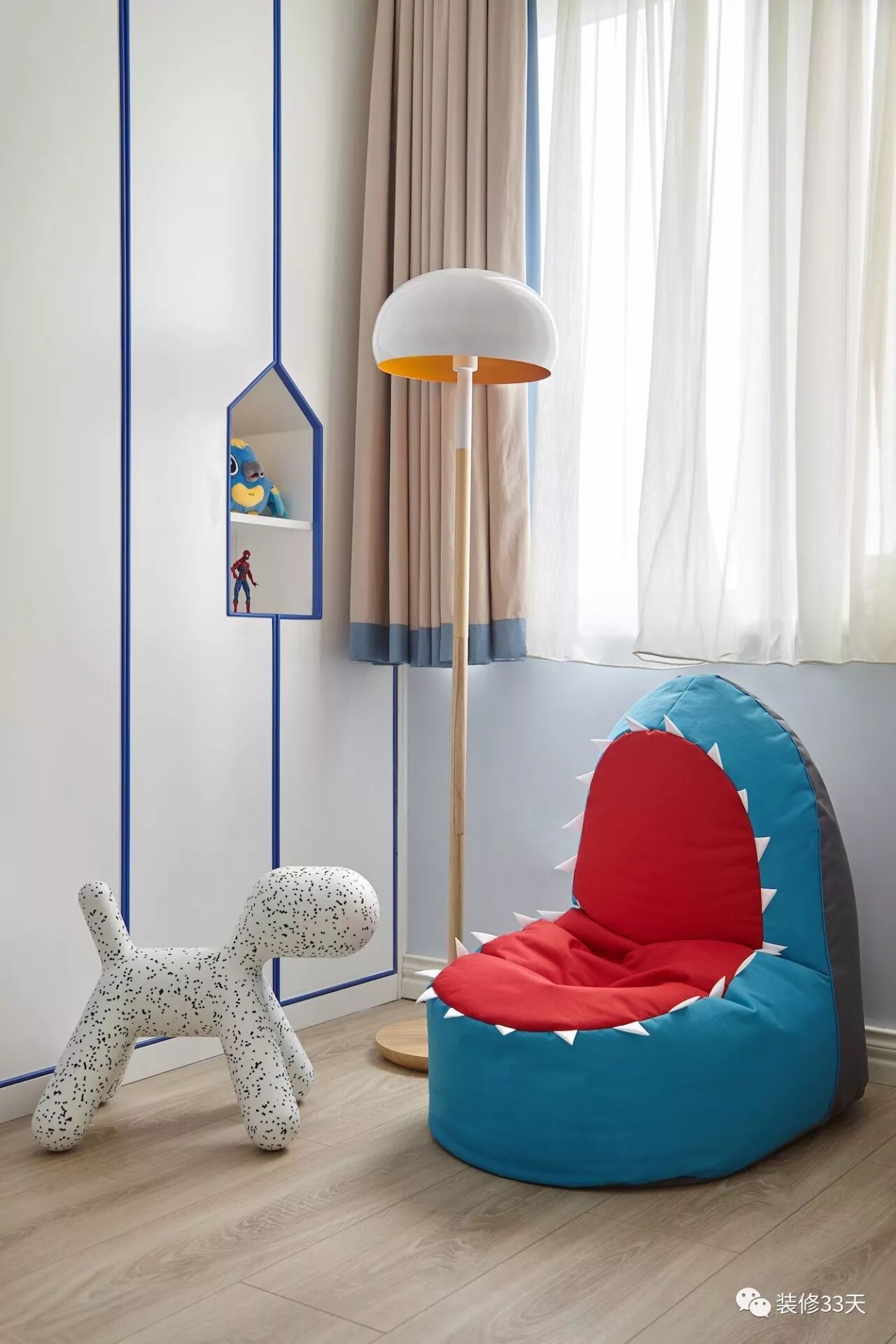 ▲ 卧室一角,童趣公仔,小狗凳,鲨鱼懒人椅,让孩子的空间充满童趣与天真