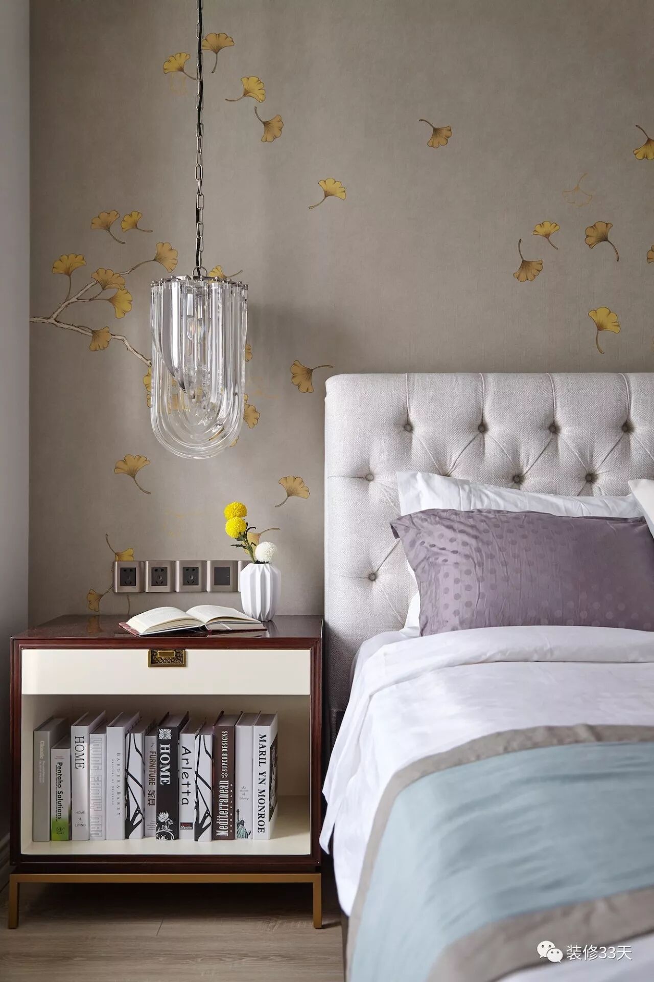 ▲ 主卧延续原木色地板,极简吊顶无主灯设计,金黄银杏叶墙纸铺贴床头背景,让立面充满灵动性