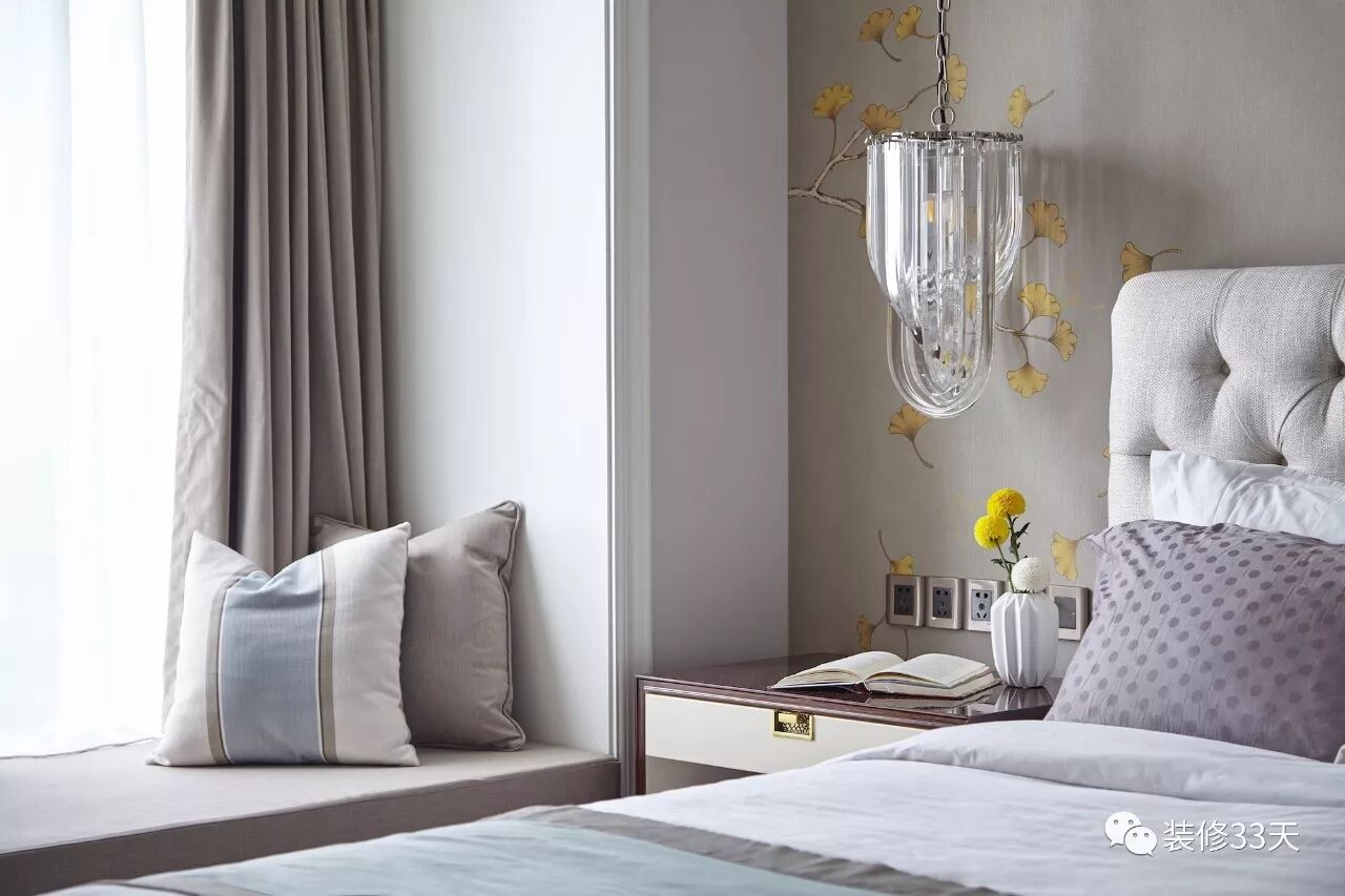▲ 卡其色大床柔软舒适搭配开放式收纳床头柜,晶莹的EICHHOLTZ床头吊灯呼应餐厅主灯,如绸缎般流线优雅