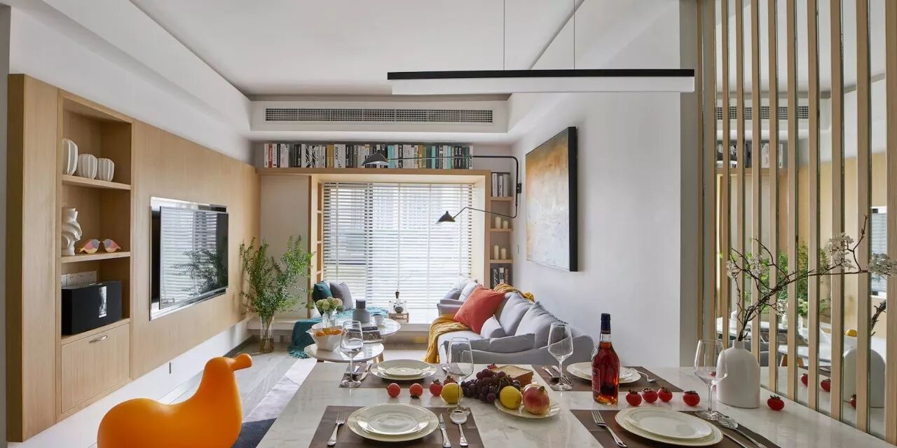 ▲ 建筑面积160平,客厅采用深浅色调拼出造型,极简吊顶设计音响设备,L型皮质沙发,几何形差机组,木作大面积系统柜作背景墙