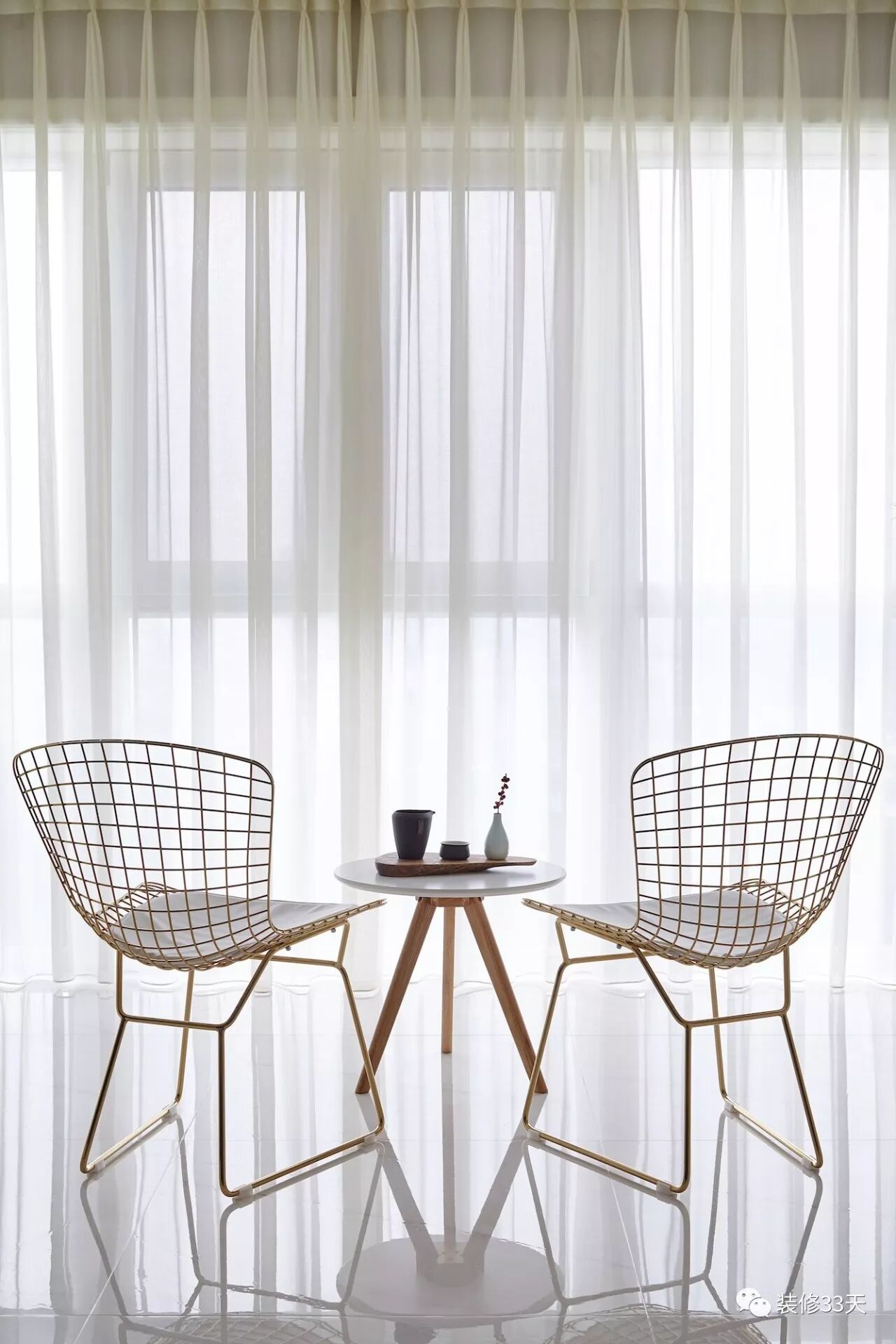 ▲ 将阳台纳入公领域,扩大空间同时增加室内光线,白色瓷砖面搭配白纱,金色镂空铁件椅与轻巧小茶几,简约又时尚