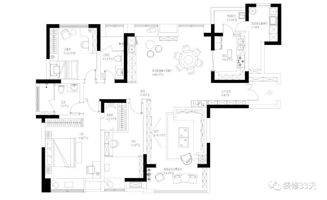 ▲ 白色木作垭口与软垫包裹出飘窗,为空间增添阳光休闲一隅