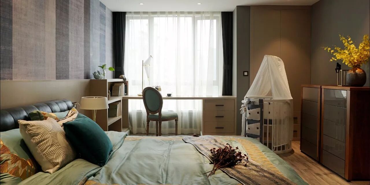 ▲ 主卧地面通铺木色地板,奶咖色乳胶漆墙面营造柔和氛围,床头一幅金框抽象画与金属质感吊灯呼应,给柔美空间增添一份质感