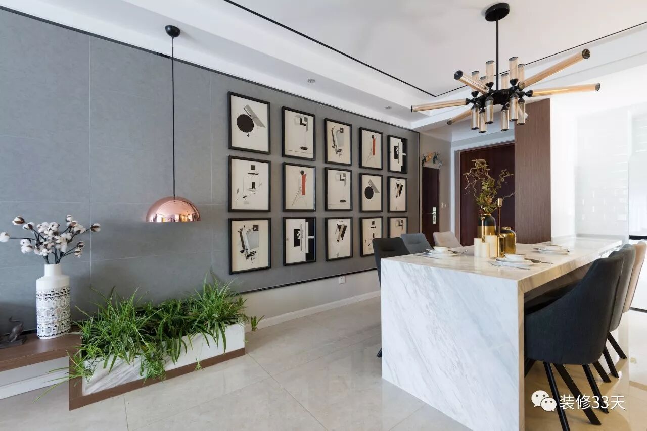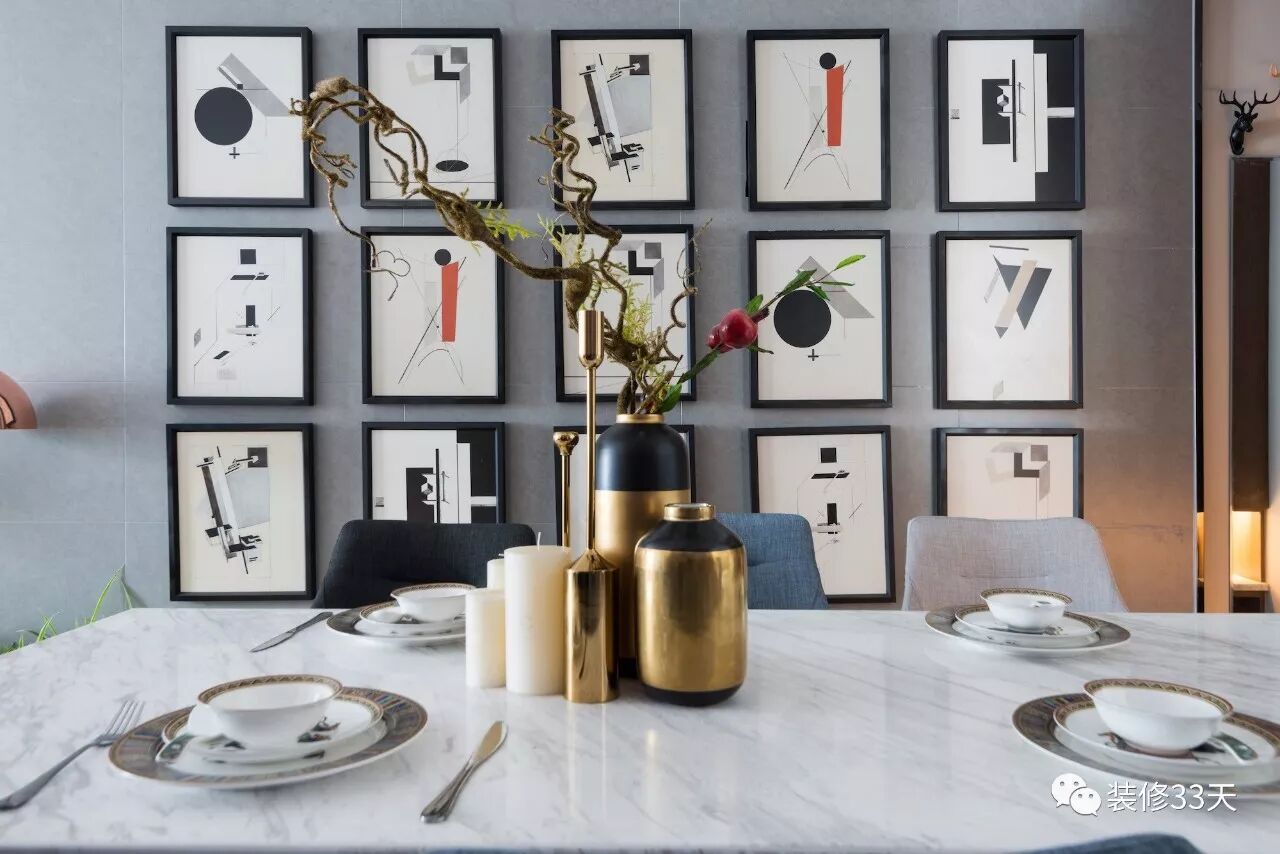 ▲ 餐厅背景墙采用多幅装饰画有序排列,自成一派