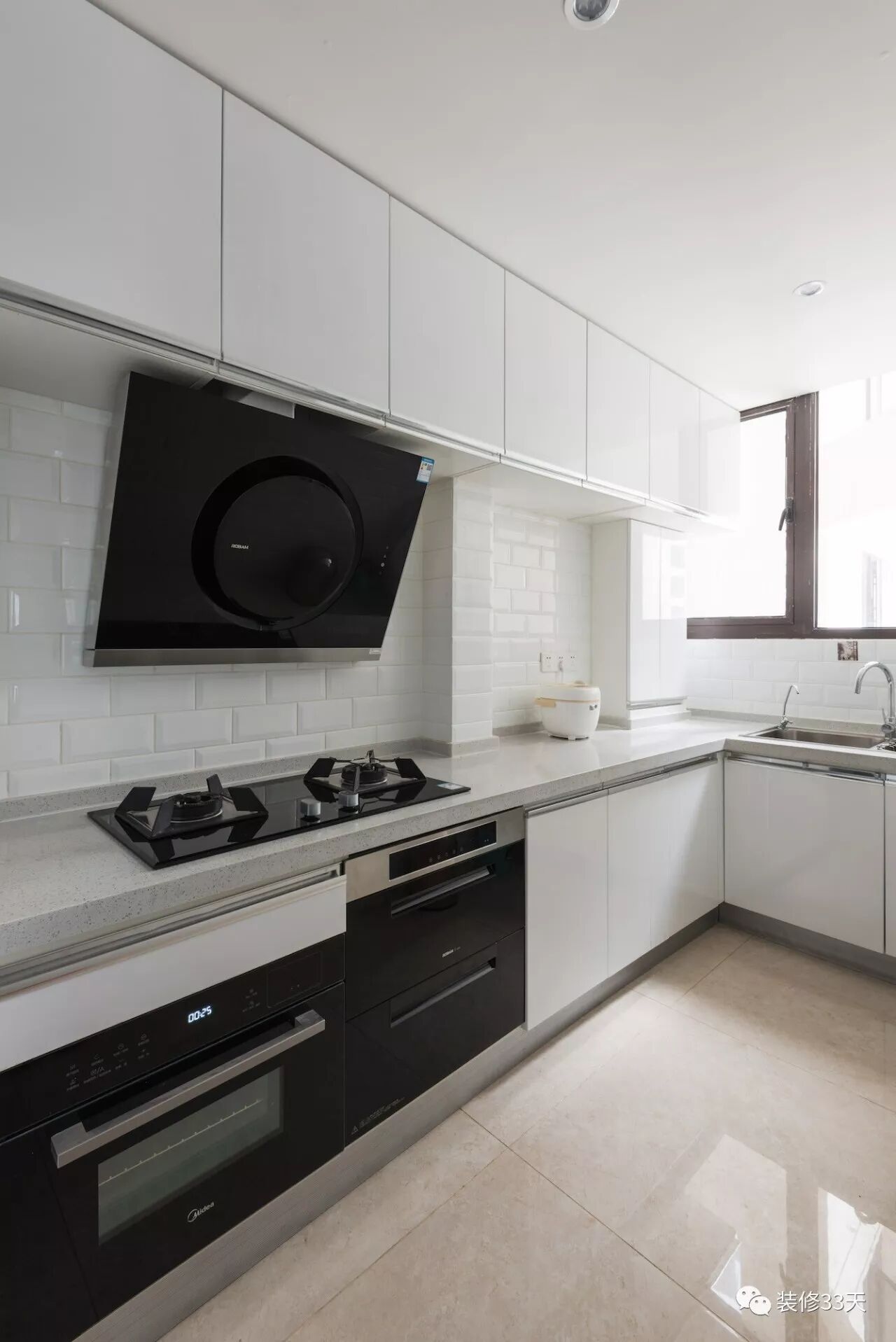 ▲ 厨房地面延续公领域瓷砖铺贴,墙面采用白色地铁砖工字铺贴,搭配白色橱柜,充足收纳空间让厨房干净利落