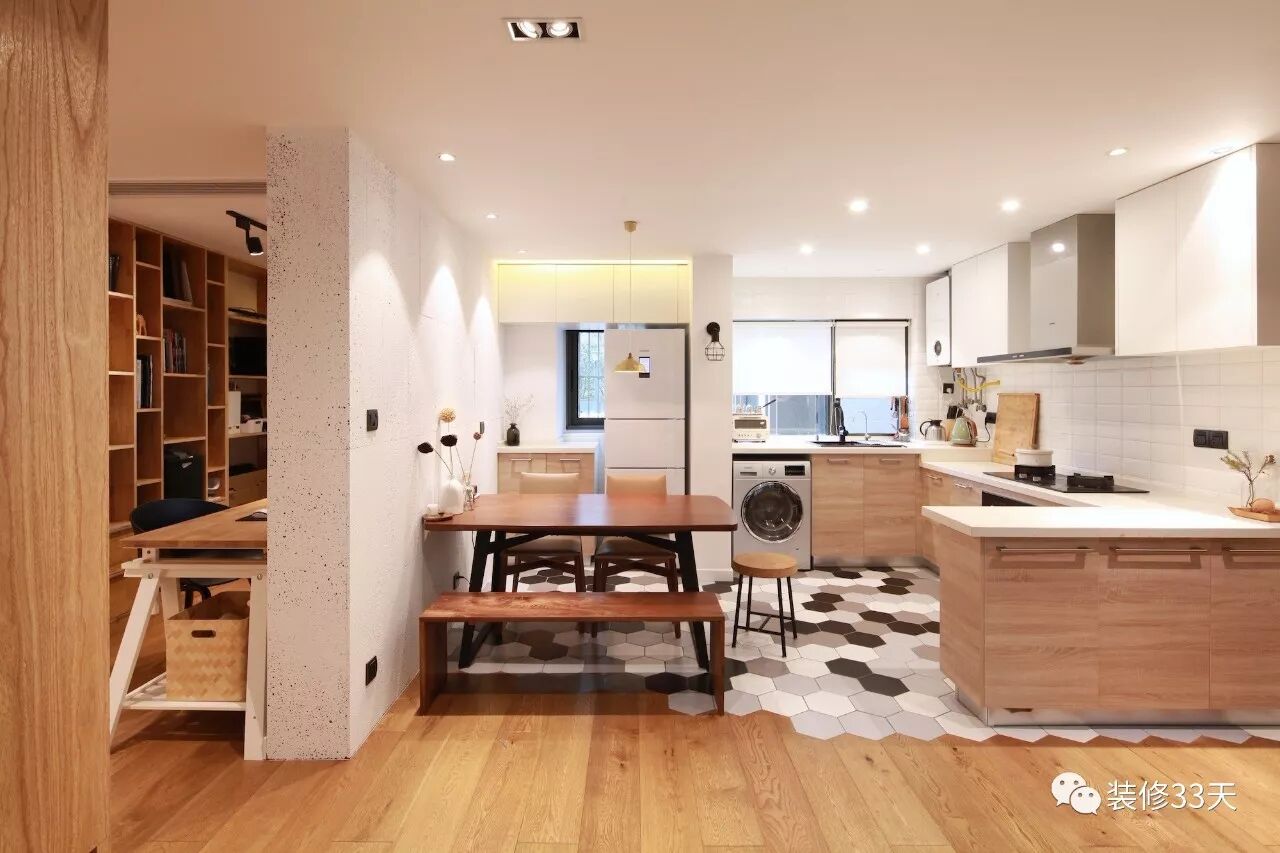 ▲ 从厨房延续至餐厅地面,大胆尝试梨花木地板和六角砖拼接,渐变拼接增强层次感的同时起视觉延伸的效果
