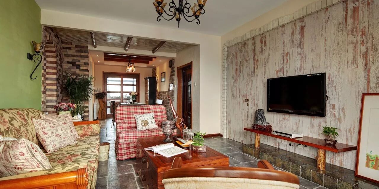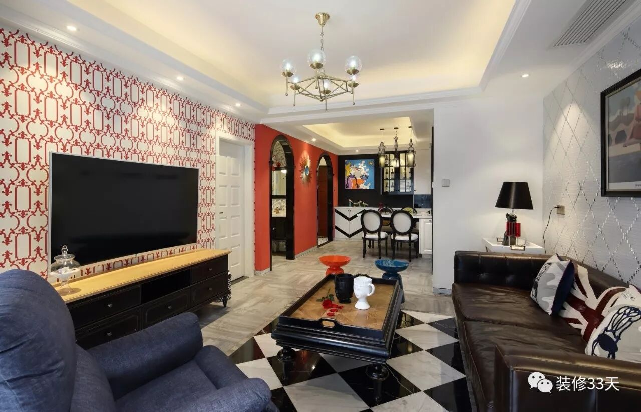 ▲ 设计师运用绚丽色彩,别具一格的装饰进行搭配,电视背景铺贴复古壁纸,与远处的弧形门洞,混搭出古朴又新潮的时尚感