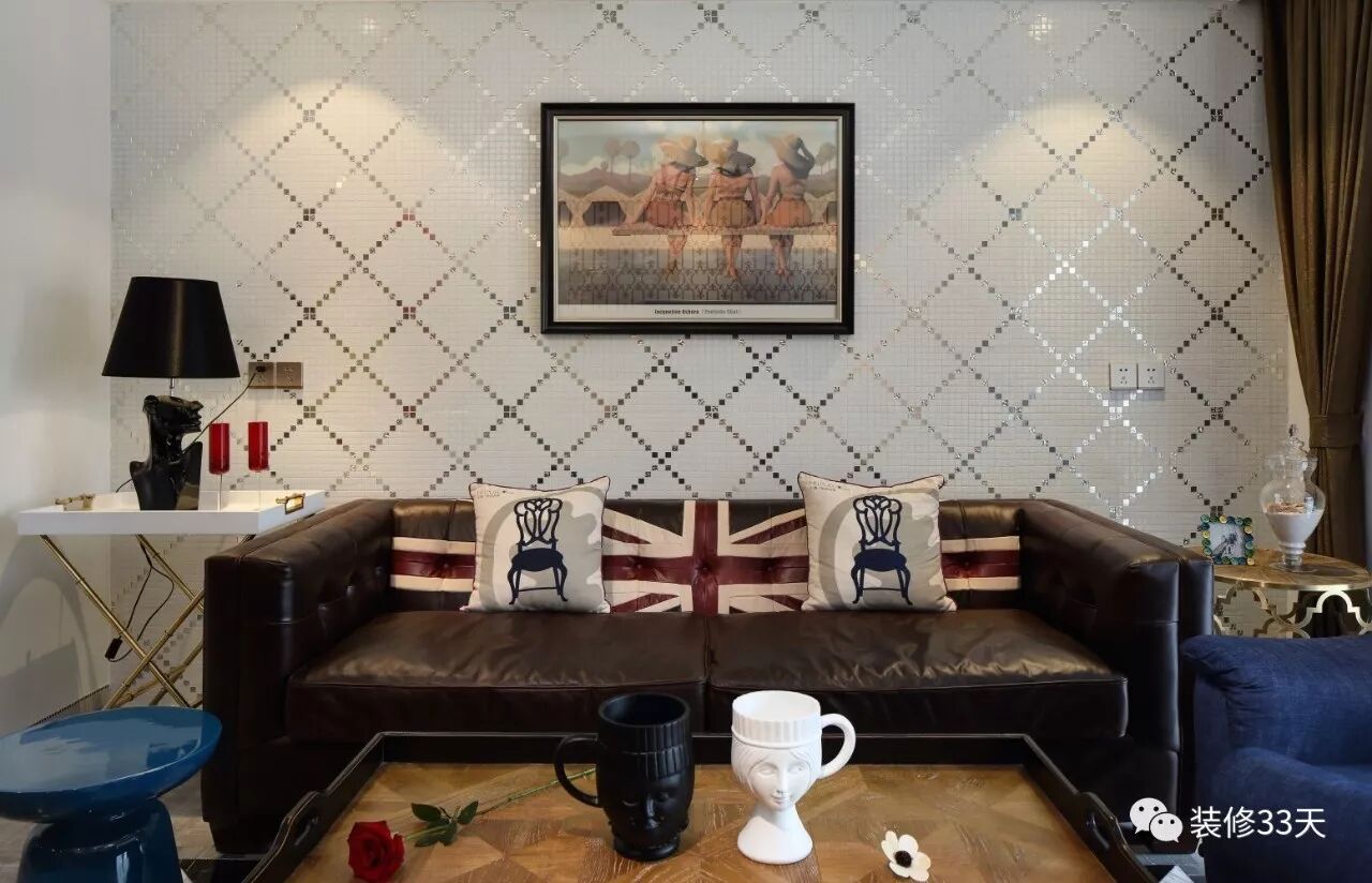 ▲ 客厅采用马赛克拼贴别致背景墙,深棕色皮质沙发,深蓝单椅与造型凳,金属色小茶几与边几,整体将功能与美感完美融合