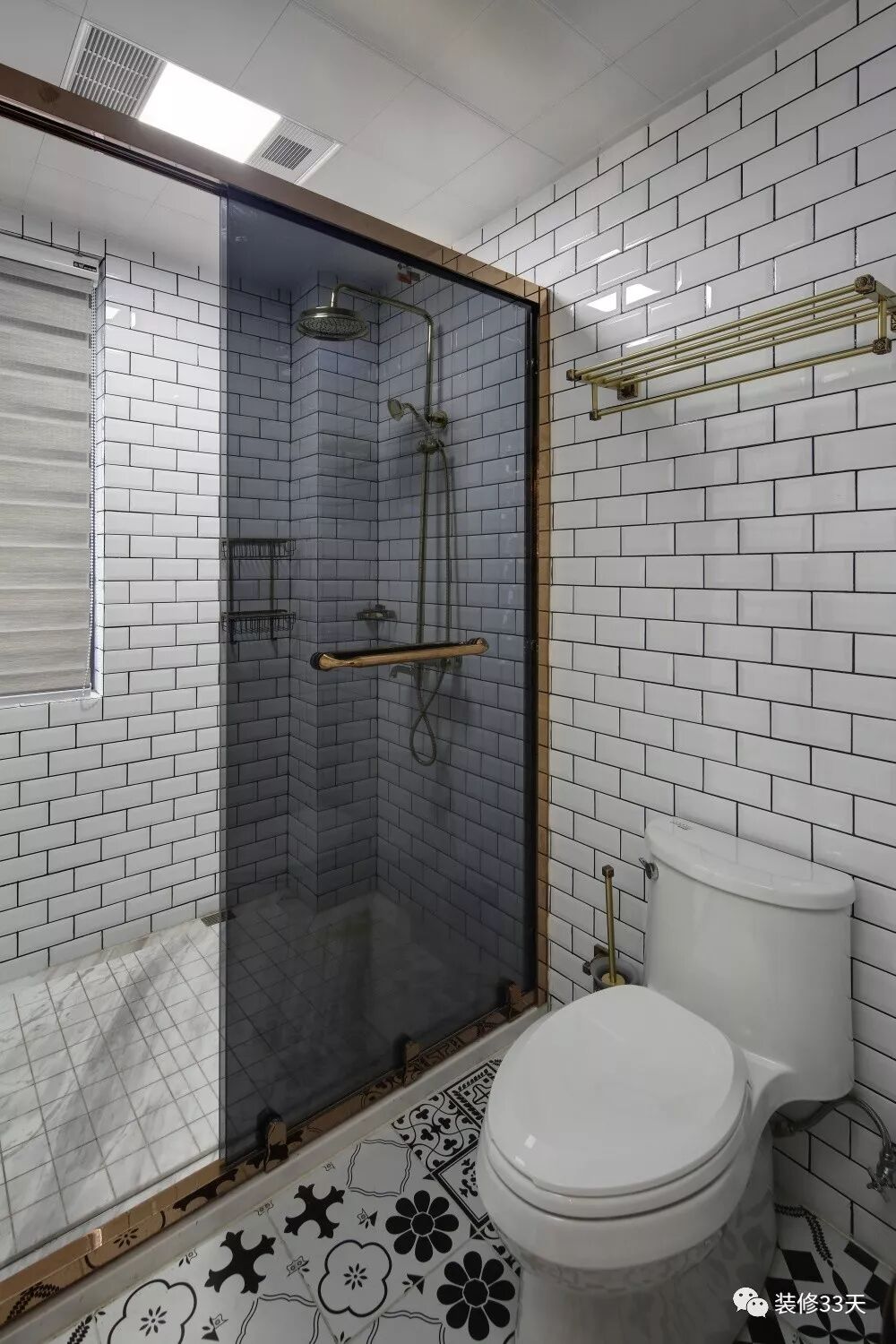 ▲ 卫生间内部铺贴花砖,墙面采用白色地铁转工字铺贴,灰玻淋浴房给空间增添一丝神秘感