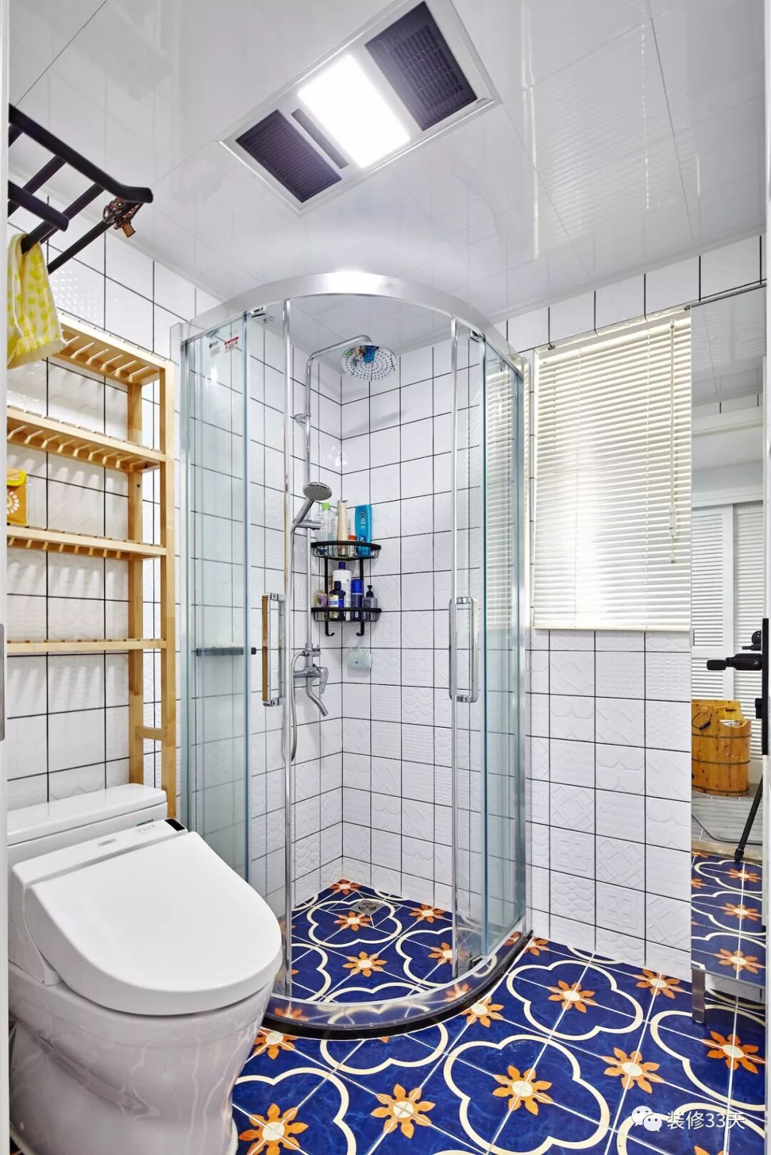 ▲ 卫生间花砖地面搭配白色暗花瓷砖,智能马桶享受智能生活