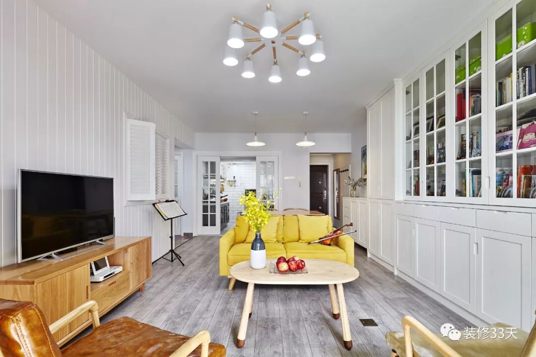 ▲ 实木与真皮材料的运用增添居所质感,鹅黄色布艺沙发凸显空间活泼时尚感,白色拉槽电视背景墙包含主卧隐形门片