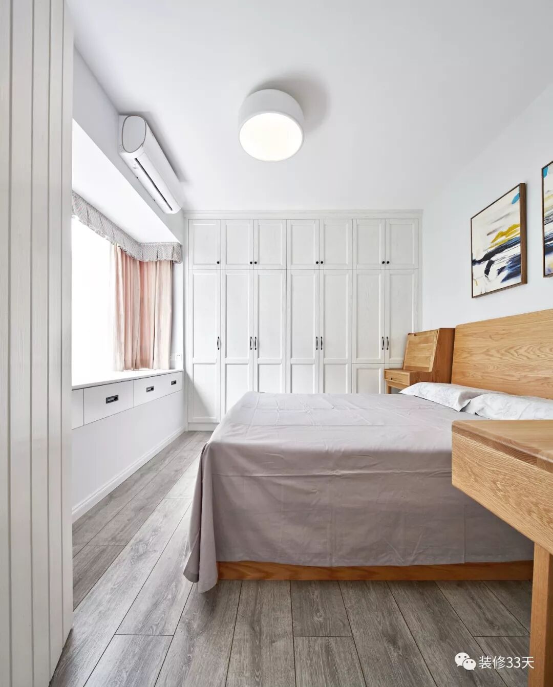 ▲ 主卧地面通铺灰色系木质地板,侧面嵌入式置顶大衣柜,床尾采光飘窗兼具抽屉收纳