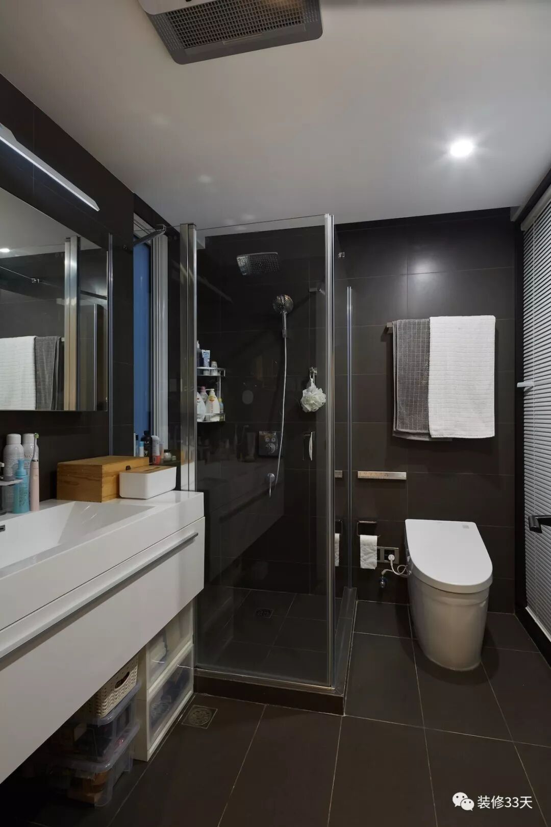 ▲ 主卫地面通铺深色瓷砖,延伸铺贴上墙,搭配白色卫浴与防水石膏板吊顶,玻璃淋浴房干湿分区