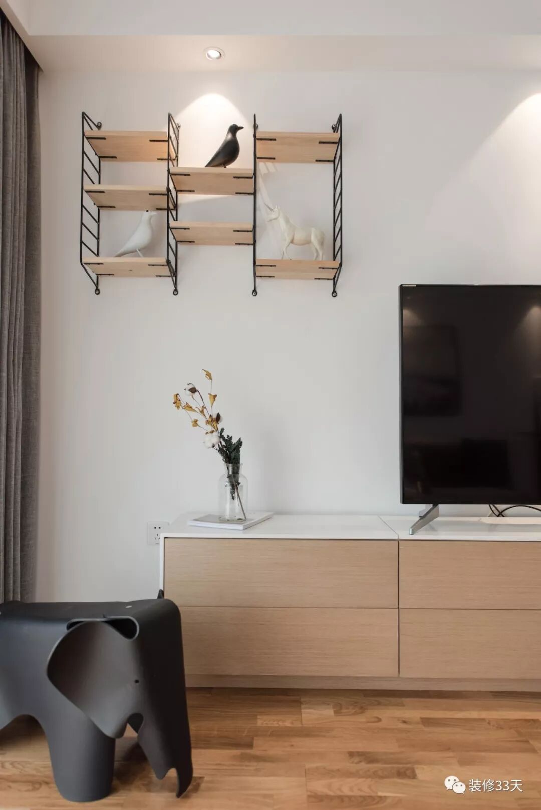 ▲ 电视柜也是整体木作的一部分,整体家具定制让空间风格和谐统一,留白背景装铁件木质层板架,美观实用