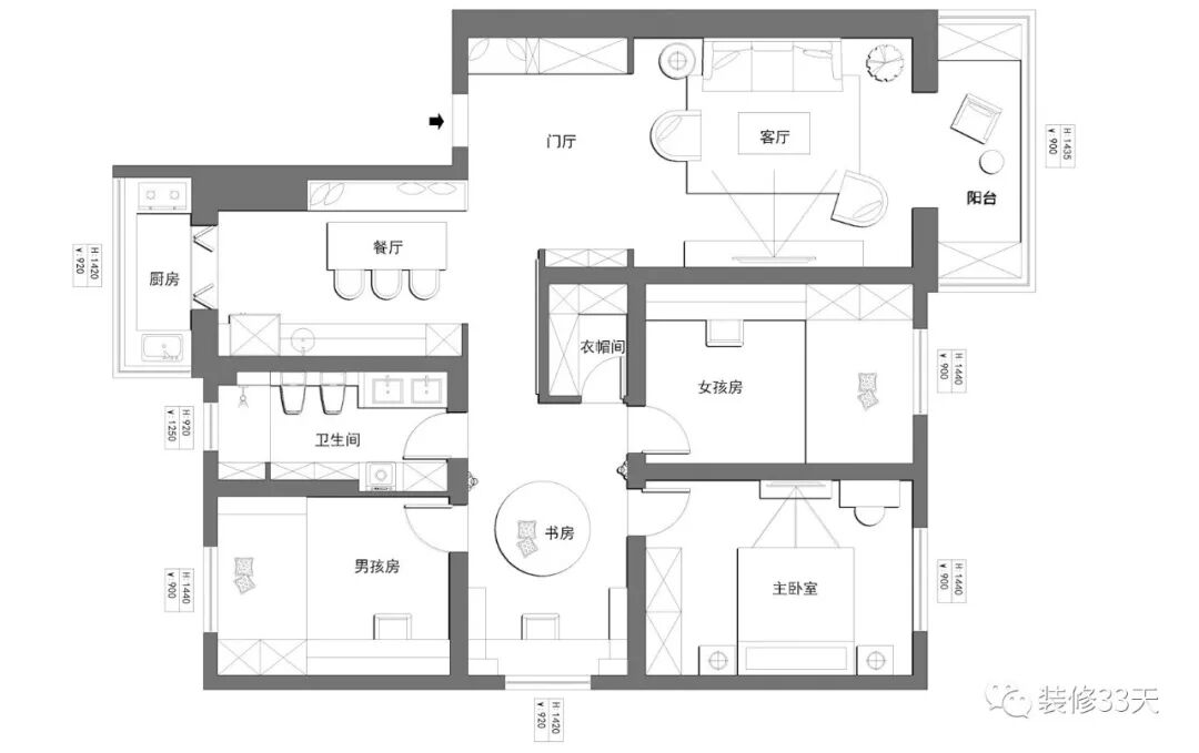 ▲ 建筑面积130平,使用面积110平,造价36万(软硬装+家具家电),入户整体木作收纳柜,书架,换鞋衣帽区,解决生活所需