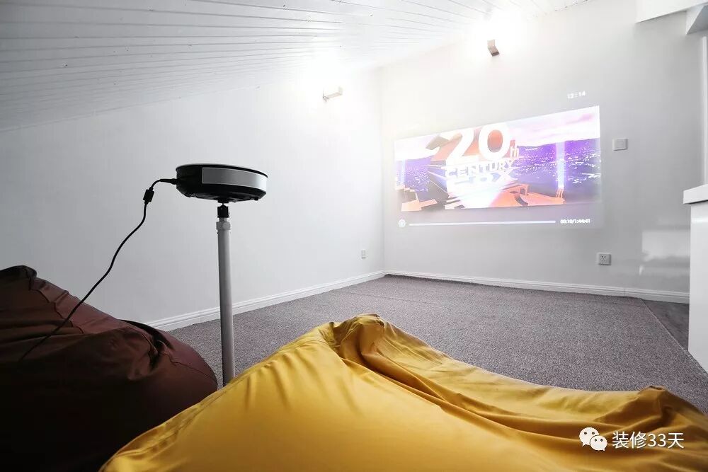 ▲ 书桌对面,设计一个影音室,利用斜顶高的一面做投影墙,斜顶低的一面放上懒人沙发,惬意舒适