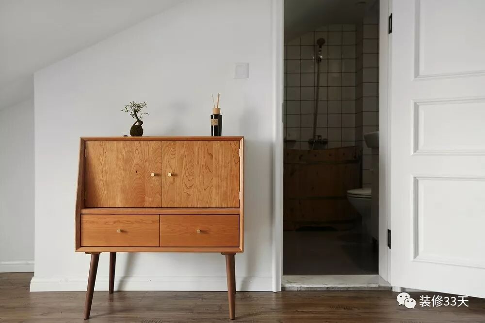 ▲ 从楼梯上来第一眼的位置,放置一个斗柜来作端景,一旁是卫生间入口
