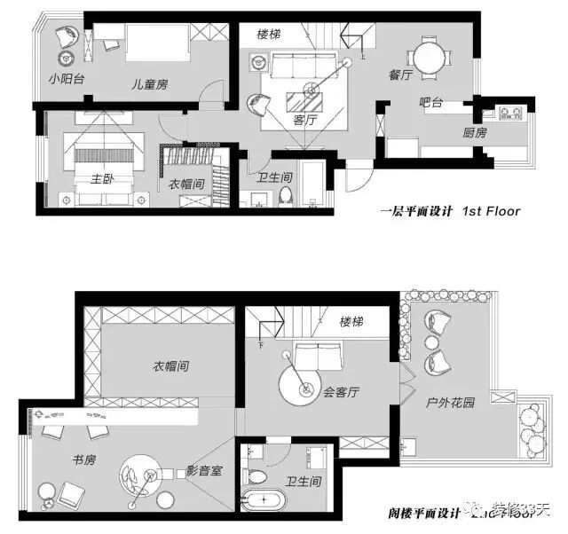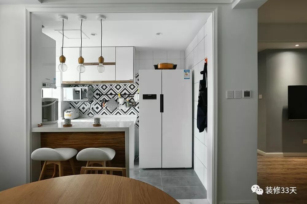 ▲ 空间以吧台作软隔断,厨房黑白灰点缀花砖与木色元素,实用耐看