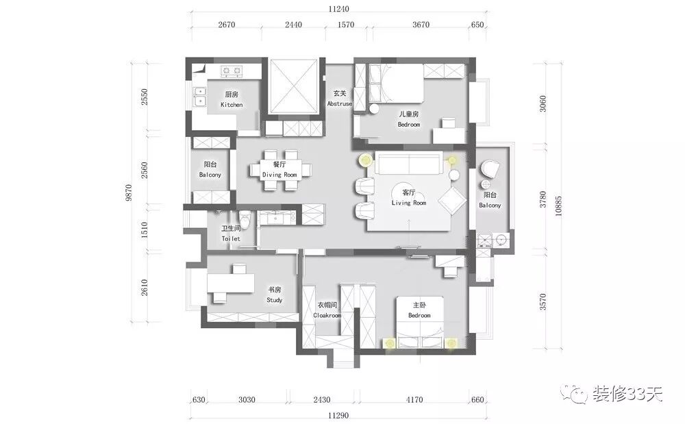▲ 次卧灰白色调,搭配木色家具,黄色壁纸床背景,空间被瞬间提亮