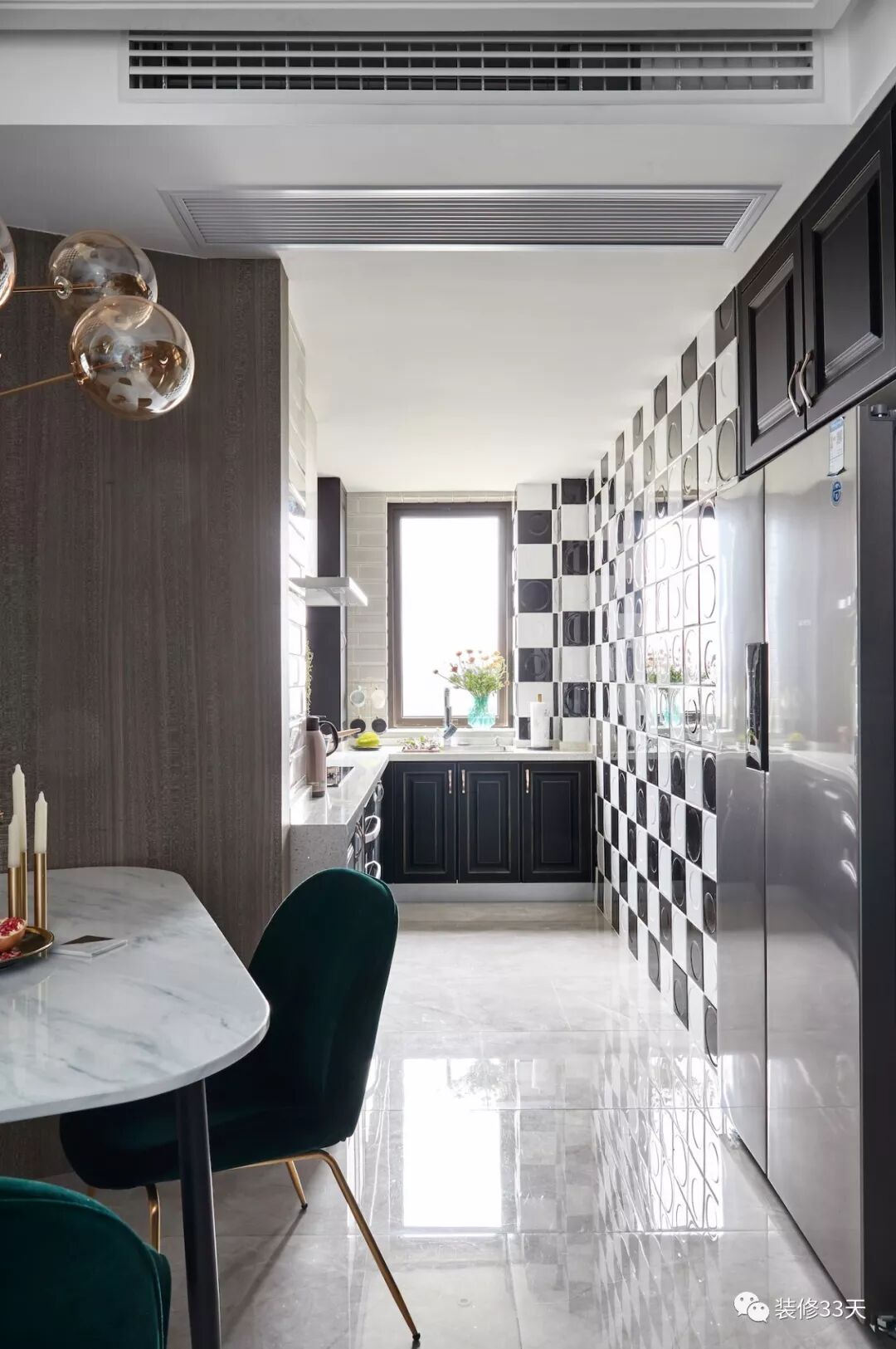 ▲ 开放式厨房,L型橱柜搭配黑白墙砖拼图出个性背景