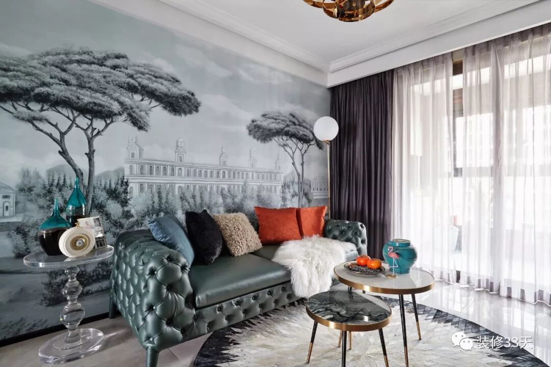▲ 定制款墙纸壁画,搭配墨绿色皮沙发,点缀精致软装,并用一抹橙色增添对比度,时尚低奢中带着清雅与气质