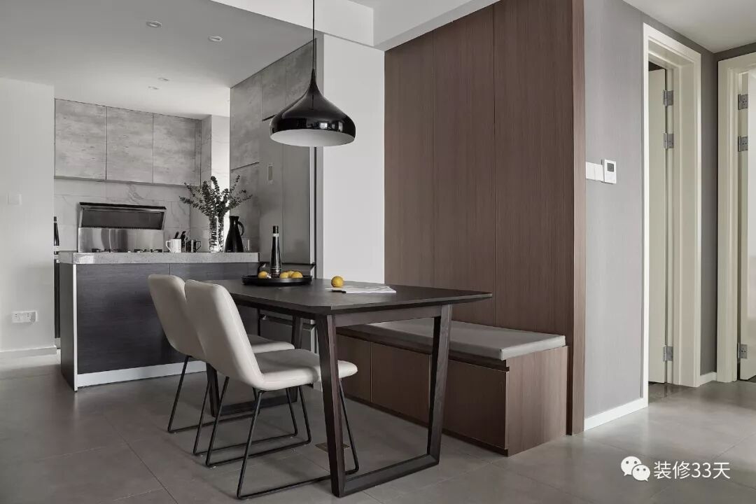 ▲ 入户左侧即为开放式餐厨设计,保证了空间的采光与空气的流动性,中性色橱柜显的厨房清爽有格调