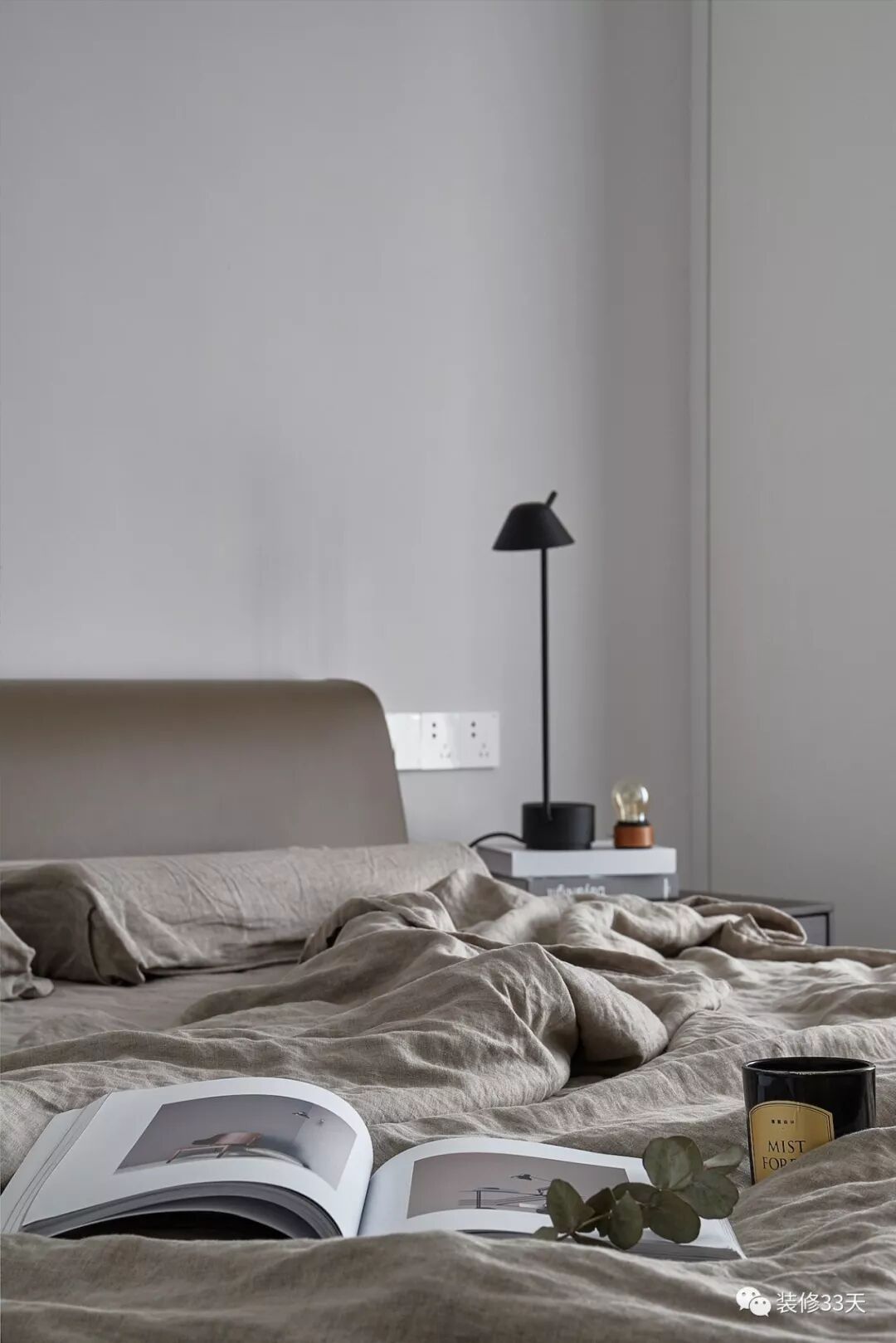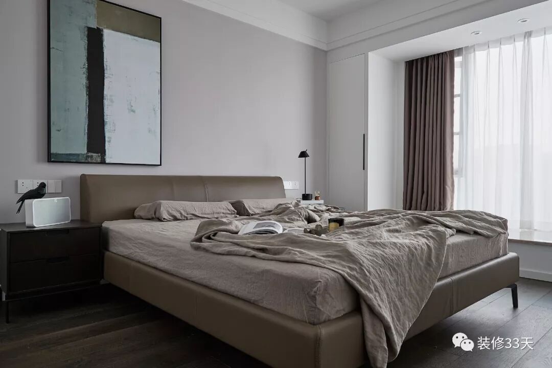 ▲ 配色上通过深浅对比,打造时尚利落的空间,亚麻色床品营造出静谧且宁和的睡眠环境