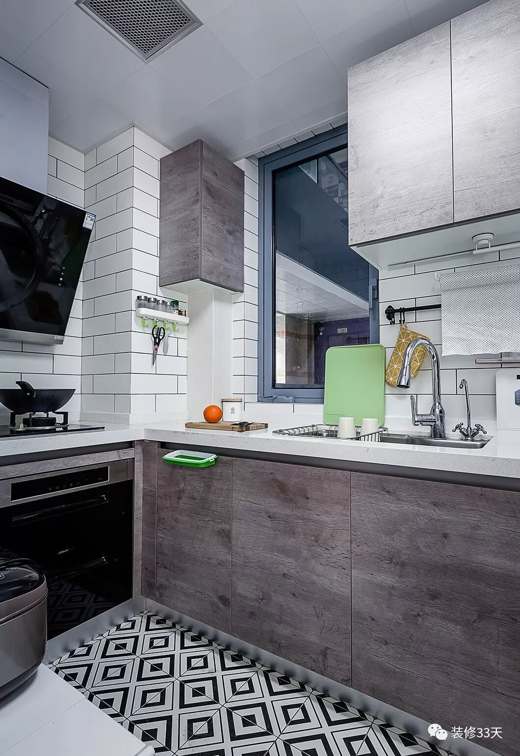 ▲ 厨房地面采用黑白系花砖拼贴,墙面选用白色瓷砖工字铺贴,灰色艾格板柜门质感丰富