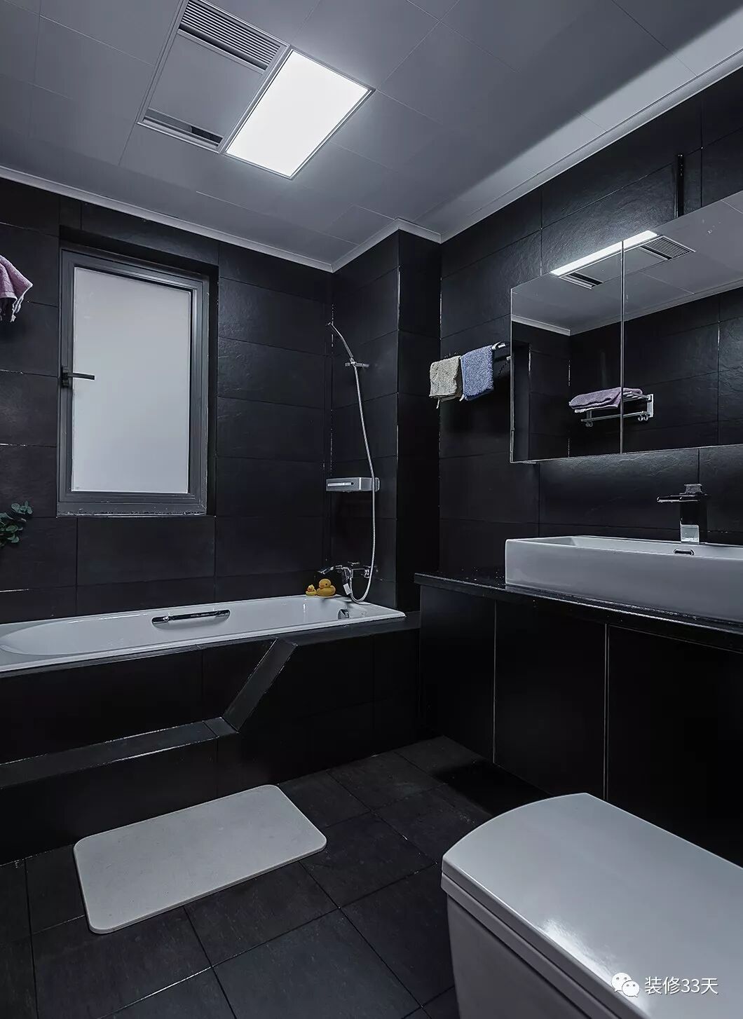 ▲ 主卫地面与墙面通铺黑色瓷砖,与黑色浴室柜呼应,搭配白色卫浴,空间个性而私密