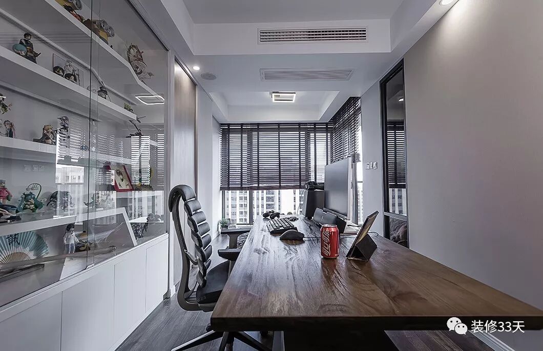 ▲ 书房现代简约的空间,木色书桌后方木作整墙展示柜作背景,收藏业主从各地搜集来的手办